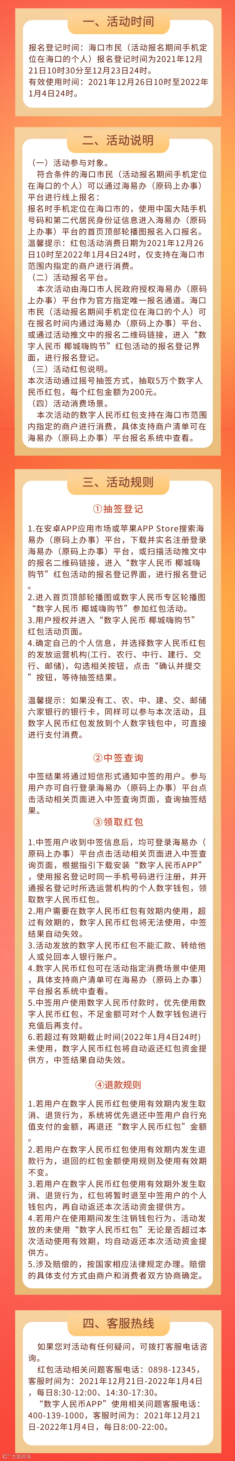 本次“数字人民币 椰城嗨购节”红包活动通过抽签的方式向海口市民发放数字人民币红包,获得数字人民币红包的用户可在有效期内在海口指定商户进行消费。具体活动规则和适用商户可通过海易办(原码上办事)平台报名系统中查看,也可拨打客服热线进行咨询。