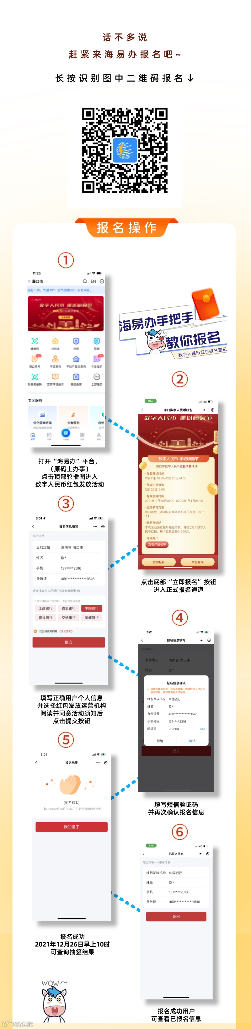 海口市民(活动报名期间手机定位在海口的个人)在报名时间内可在安卓APP应用市场或苹果APP Store搜索海易办(原码上办事)平台,下载并实名注册登录海易办(原码上办事)平台,或扫描活动推文中的报名二维码链接,进入“数字人民币 椰城嗨购节”红包活动的报名登记界面,进行报名登记。