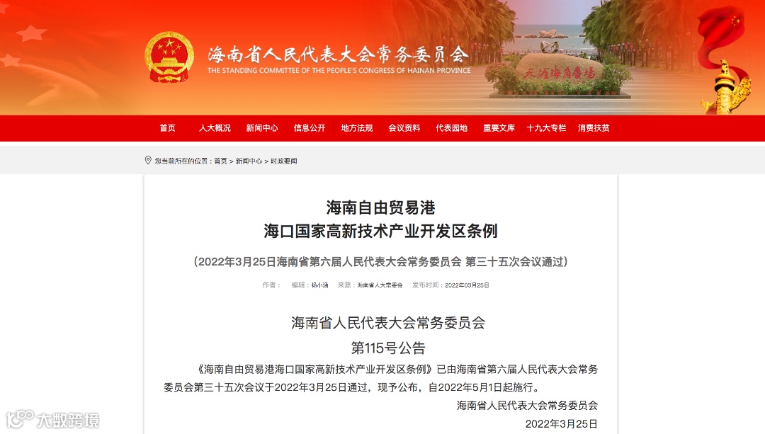2022年3月25日,海南省第六届人民代表大会常务委员会第三十五次会议通过《海南自由贸易港海口国家高新技术产业开发区条例》,自2022年5月1日起施行。