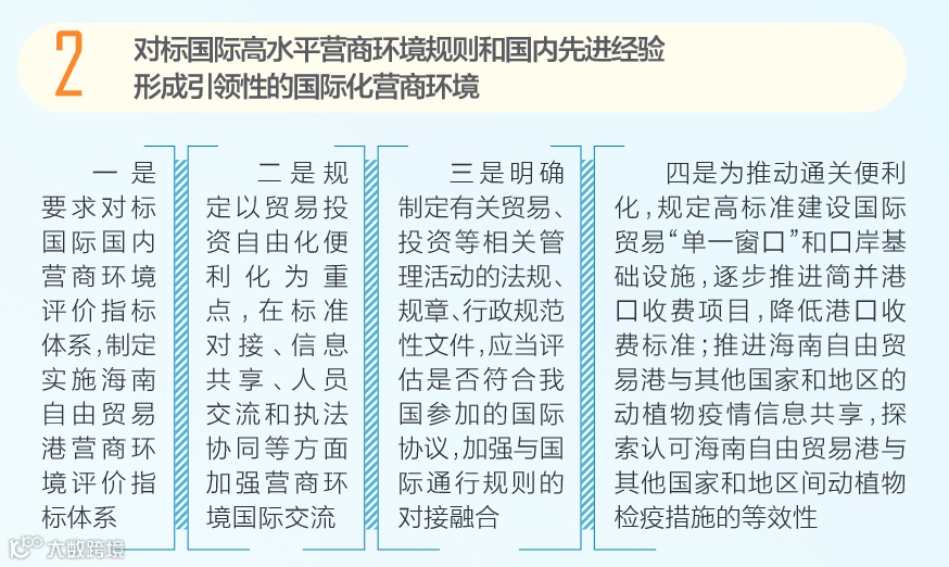 此外,对标国际高水平规则,打造公平、透明、可预期的营商环境方面,《条例》对世界银行营商环境评价的主要指标都有所回应,为优化海南自贸港营商环境提供目标指引。比如第8条规定“通关便利”,第19条规定“最简权力清单”, 第24条规定“一件事一次办”和“证照联办”等。