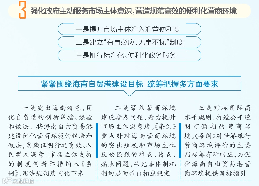 作为《中华人民共和国海南自由贸易港法》(以下简称海南自由贸易港法)颁布实施以来我省制定出台的首批配套法规之一,《条例》对标国际高水平营商环境规则和国内先进经验,以打造法治化、国际化、便利化的营商环境为目标,坚持市场主体需求导向,聚焦海南营商环境建设中的堵点问题,不重复上位法,立短条例,从优化市场环境、政务环境、法治环境等方面作出规范。