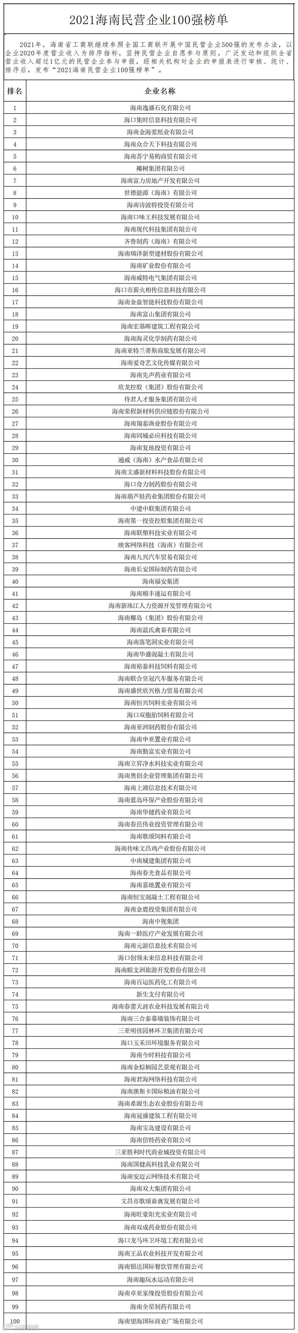 2021海南民营企业100强榜单