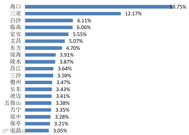 参与度指数显示,民间投资前五大地区为:海口、三亚、白沙、临高、定安,分别占比18.75%、12.17%、6.11%、6.06%和5.55%。