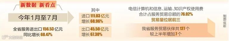 按照世贸组织《服务贸易总协定》的有关定义,跨境交付模式、境外消费模式、自然人移动模式等三种模式统称为跨境服务贸易。1月至7月,我省跨境服务贸易中,跨境交付、境外消费、自然人移动三种模式比重分别为91.73%、7.99%、0.27%。跨境交付143.59亿元,增长95.33%,其中进口101.56亿元,增长92.94%,出口42.03亿元,增长101.37%。