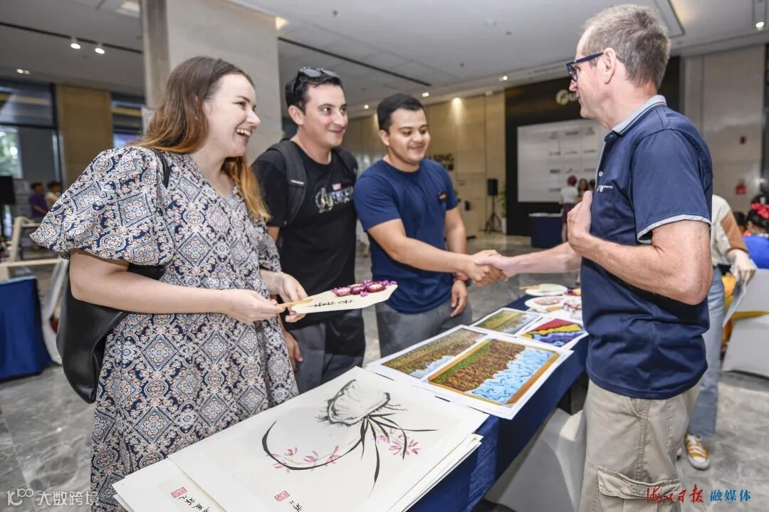 在一处摊位前,记者看到来自美国的马罗正热情地向客人介绍自己的美术作品,在一幅探索宇宙奥秘的画作中,勾勒出中文“好好学习,天天向上”的字样,将文字与艺术融为一体,“今天的活动非常热闹,感受良好,园区很有‘国际范’,我也认识了很多不同国家的朋友,之后打算将公司落户复兴城。”马罗告诉记者。