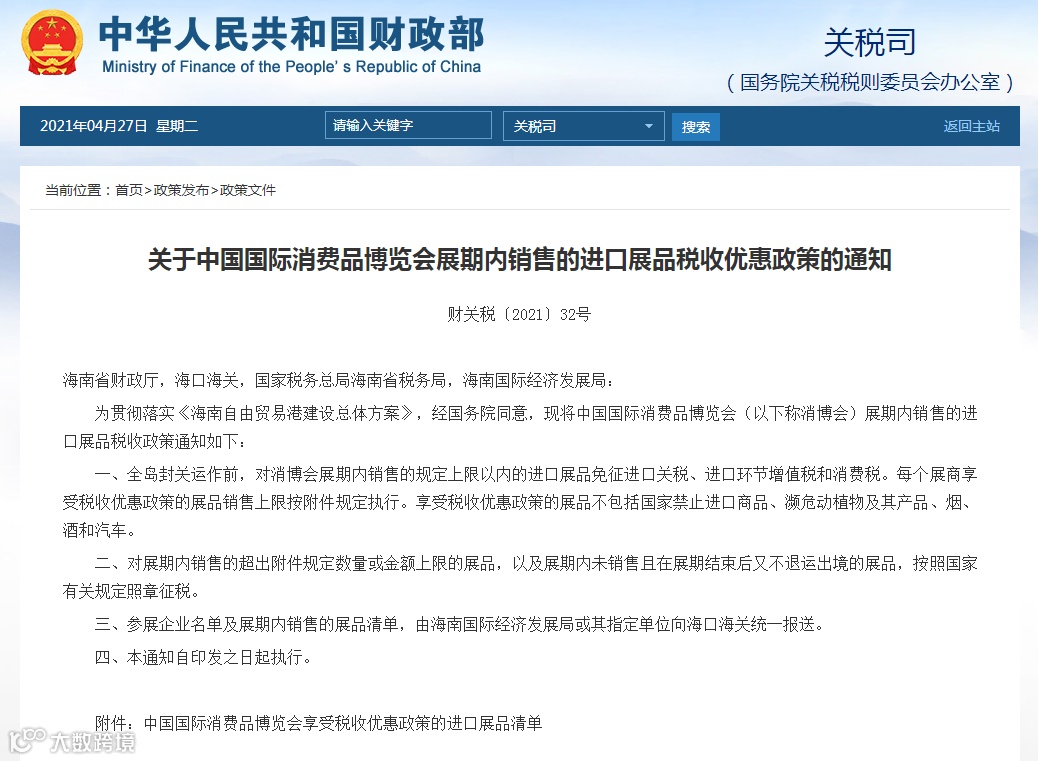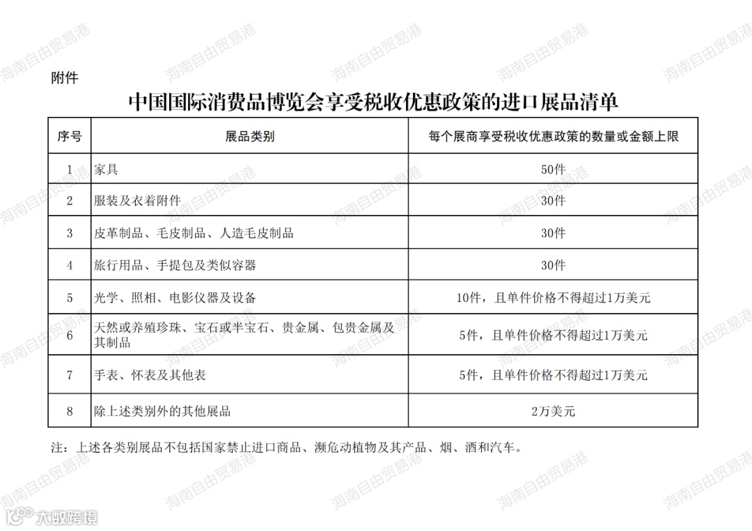 全岛封关运作前,对消博会展期内销售的规定上限以内的进口展品免征进口关税、进口环节增值税和消费税。每个展商享受税收优惠政策的展品销售上限按附件规定执行。享受税收优惠政策的展品不包括国家禁止进口商品、濒危动植物及其产品、烟、酒和汽车。