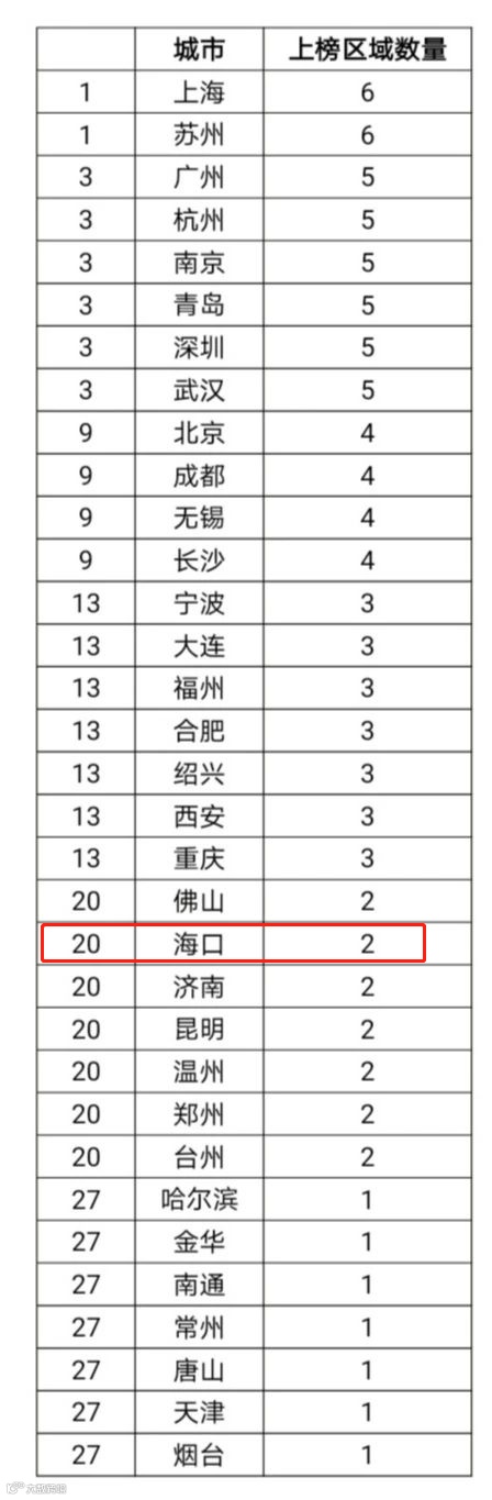 从上榜区域的城市来看,上榜区域共来自33个城市,海口位列20,有2个区域上榜。