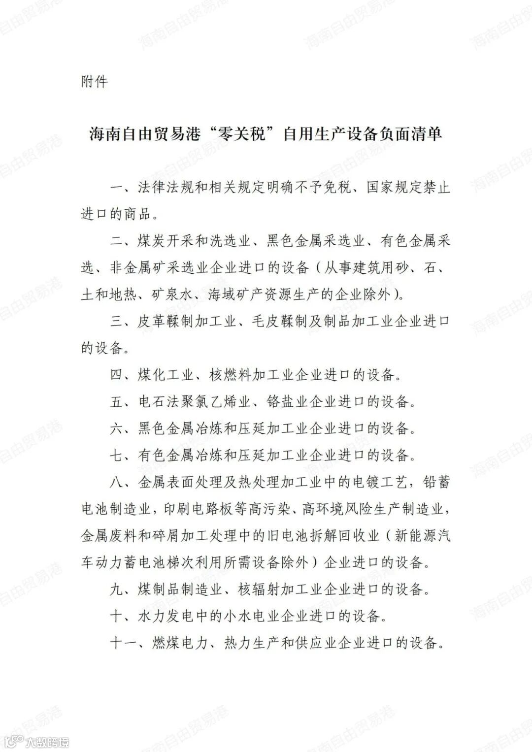 附件:海南自由贸易港“零关税”自用生产设备负面清单