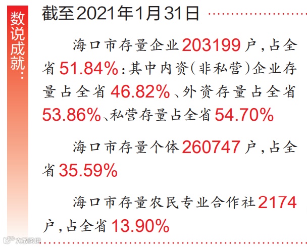 市场主体数量是反映经济发展活力的一项重要指标。据统计,2020年6月1日至2021年1月31日,海口市新增市场主体98527户,同比增长49.74%,其中,海口市新增企业50754户,同比增长110.62%;海口市新增个体47718户,同比增长14.56%;海口市新增农民专业合作社55户,同比增长14.58%。