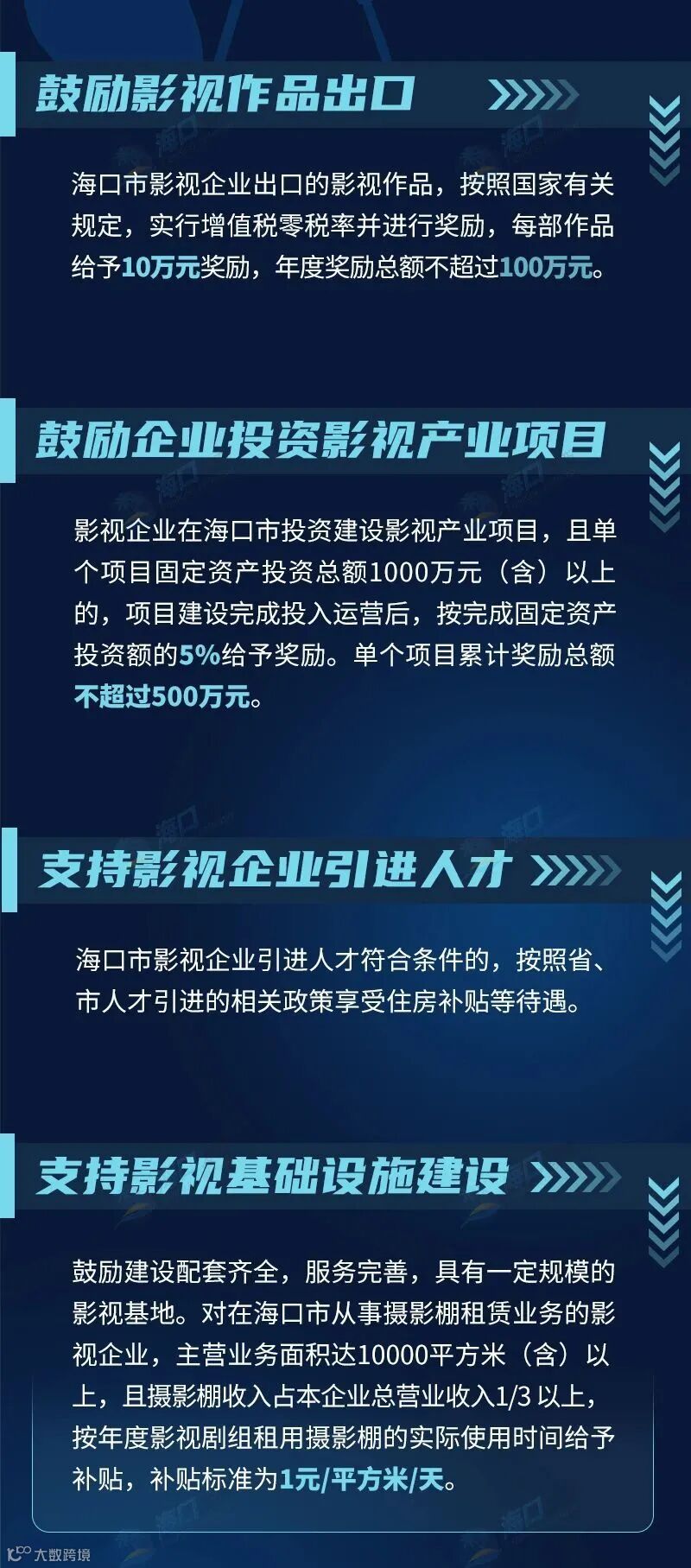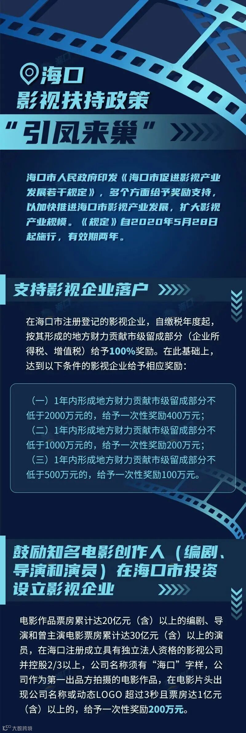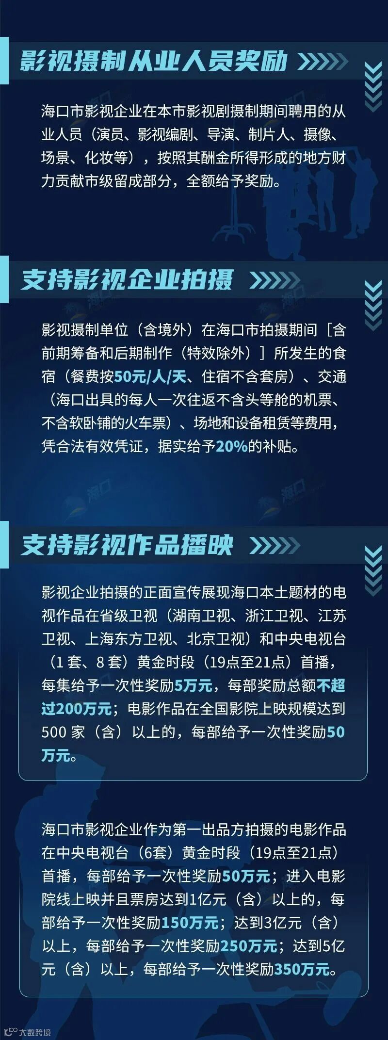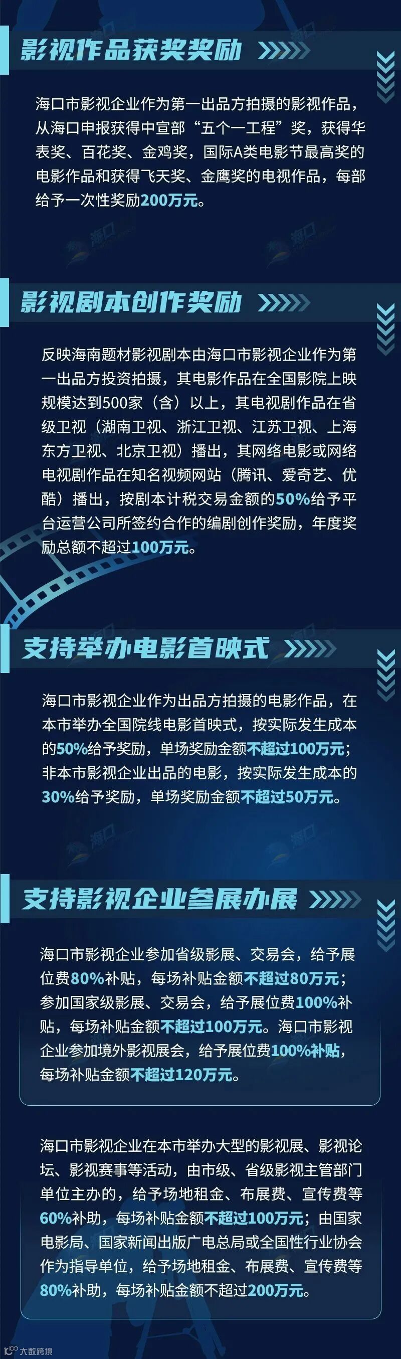 今年,海口市人民政府印发《海口市促进影视产业发展若干规定》,通过23条政策措施,在多个方面给予奖励支持,加快推进海口市影视产业发展,扩大影视产业规模。