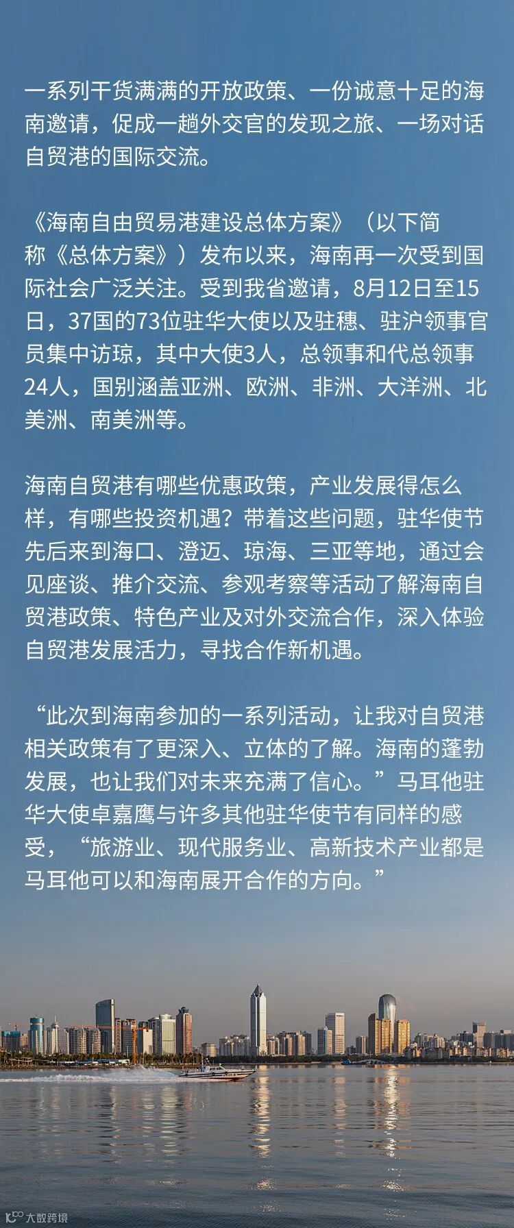 通过多听、多看、多体验、多感受,驻华使节纷纷表示,他们会发挥“扩声器”和“助推器”作用,把海南自贸港政策介绍给本国政府、社会各界和企业,抓住机遇与海南推进更多领域的合作。参访中,海南推出的国际投资“单一窗口”服务,也令柬埔寨驻海口总领事黄万达印象深刻,他觉得这一服务为投资者注册、了解相关贸易数据等提供了集中平台,也提供了更加高效的投资环境。