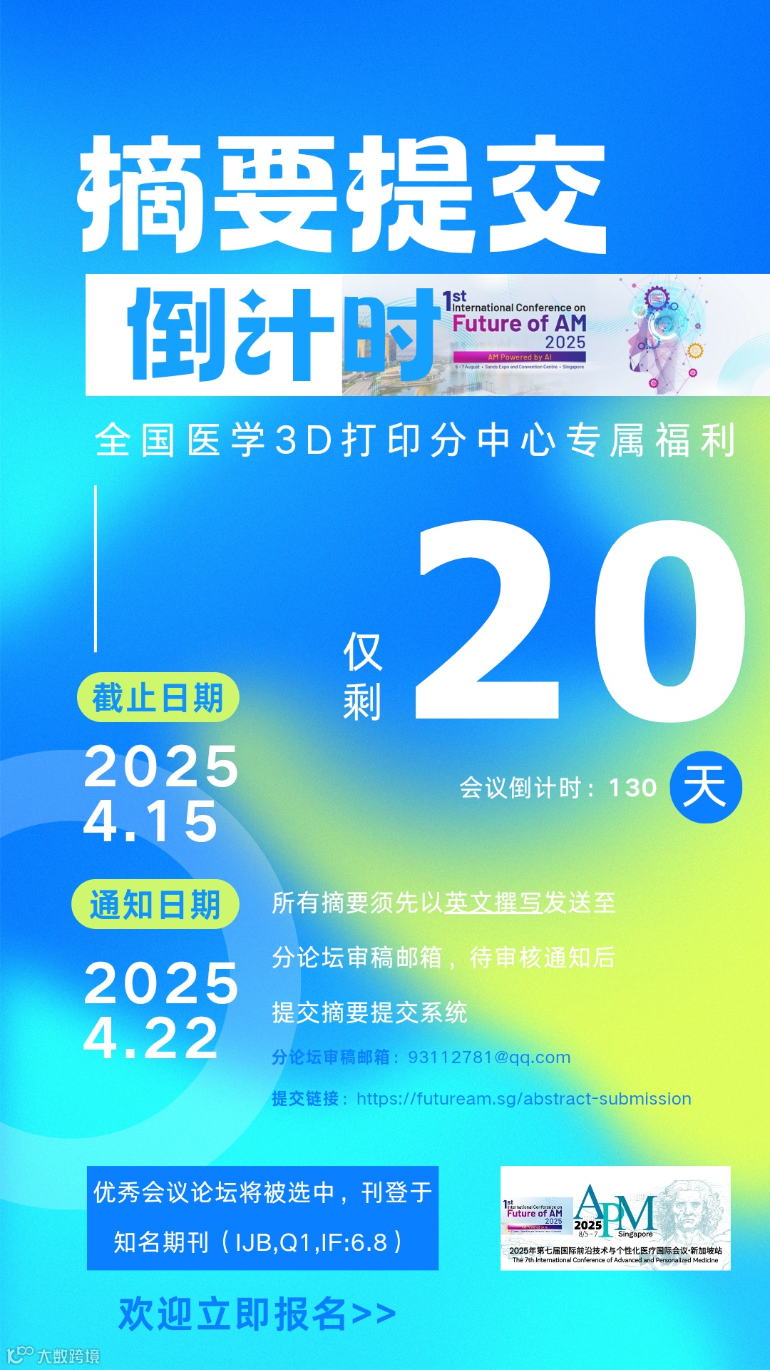 第七届国际前沿技术与个性化医疗(APM)国际会议作为Future of AM 2025(第一届增材制造未来国际会议)的重要组成部分,首次出海新加坡以分论坛的形式亮相,首次出海新加坡以分论坛的形式亮相,定于2025年8月5日-7日在新加坡滨海湾金沙会议中心召开。它将搭建跨学科、跨区域的国际合作平台,推动增材制造技术在医疗领域的产业化应用与标准共建,标志着中国医疗技术创新成果走出国门向海外的深度拓展。
