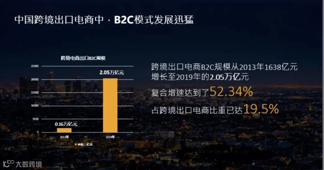 中国整个跨境出口B2C的数据显示从2013年的一千六百多亿元增长到2019年超过2万亿的规模,跨境电商的复合增长率比例已经达到了52%,B2C的业务占到跨境电商出口比重的1/5,预计B2C发展的趋势会随着跨境电商在出口贸易的模式中占比越来越大。