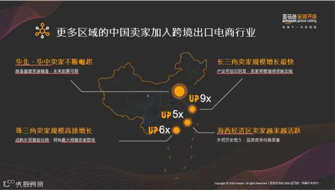 华南地区以广东为代表,是跨境电商最初始和发展最快的地区,因为广东地区的中国卖家是自己发现的跨境电商的机遇,快速的制定出海策略。在过去的4~5年发展过程中,中西部地区,首先是向中部地区发展,长三角的中国卖家的增长规模最快。西部地区比如福建区域的卖家也非常活跃,在跨境电商趋势的背景下,借助完善的产业带资源储备,华中地区和华北地区的中国卖家不断崛起。