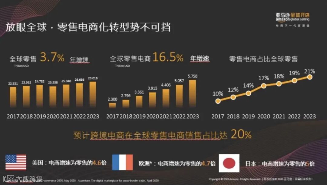 近几年全球的零售行业在不断持续的增长,尤其是2020年COVID-19疫情的原因,对整个的跨境电商起到了一个加速的作用。