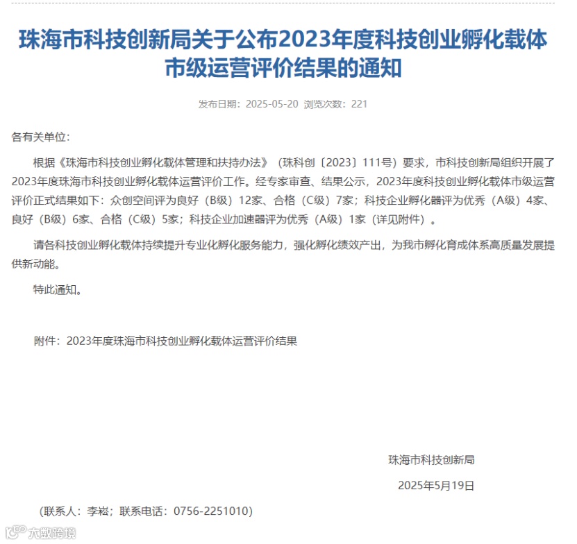 近日,珠海市科技创新局正式公布2023年度科技创业孵化载体运营评价结果,南方软件园孵化器、加速器凭借扎实的孵化服务能力,双双荣获“优秀(A级)”评定。此次评价共产生4家A级孵化载体单位,南方软件园成为唯一同时获评孵化器、加速器“A级”荣誉的孵化载体。