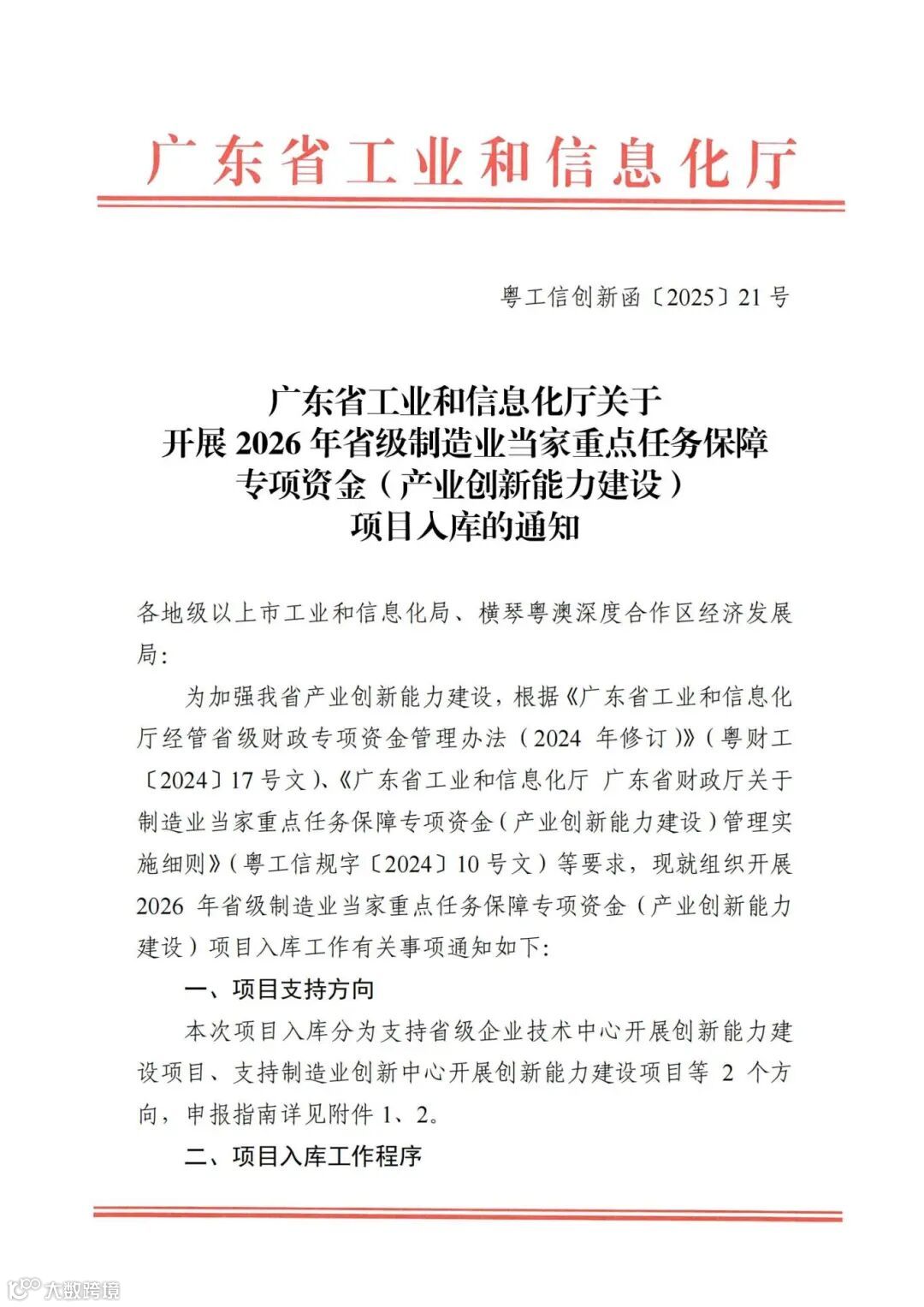 为加强我省产业创新能力建设,根据《广东省工业和信息化厅经管省级财政专项资金管理办法(2024年修订)》(粤财工〔2024〕17号文)、《广东省工业和信息化厅 广东省财政厅关于制造业当家重点任务保障专项资金(产业创新能力建设)管理实施细则》(粤工信规字〔2024〕10号文)等要求,现就组织开展2026年省级制造业当家重点任务保障专项资金(产业创新能力建设)项目入库工作有关事项通知如下: