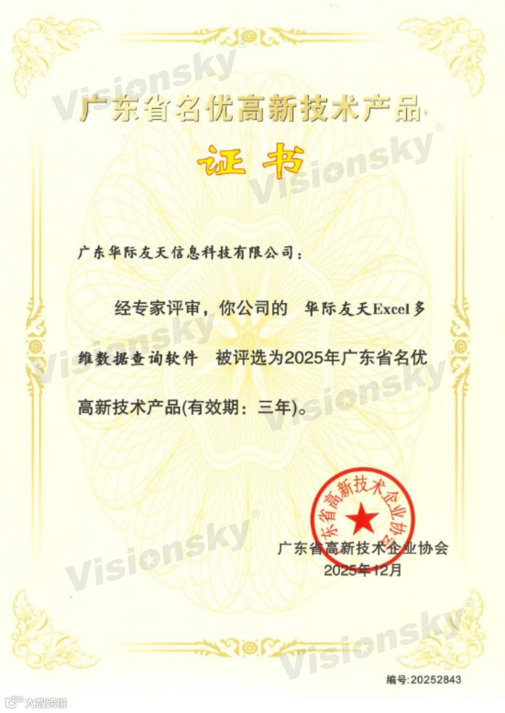 导读:2025年最后一月,经专家评审,我公司的“华际友天Excel多维数据查询软件”被评选为2025年广东省名优高新