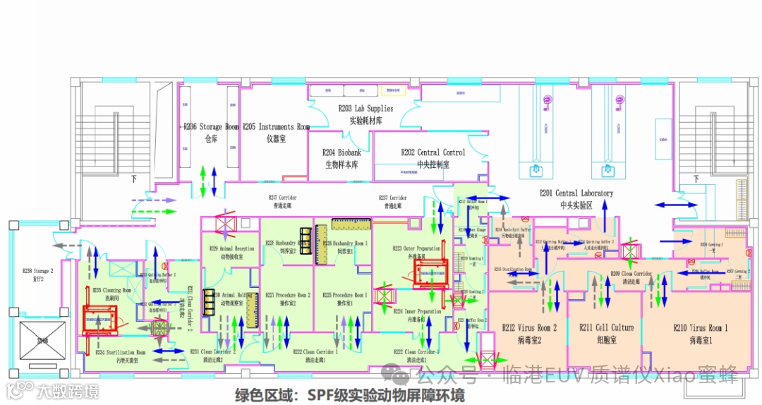 人员进出路线:外环境 → 更衣室 → 缓冲间 → 洁净走廊 → 实验区 → 路径单向流动.