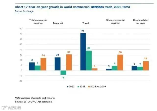 展望2024年,WTO提出,夏季将在欧洲举行的奥运会和欧洲足球锦标赛,以及各经济体为鼓励外国游客而放宽签证要求,都可能加速2024年客运的复苏。同时,随着人们对其他交通方式的可持续性日益关注,铁路客运也有望回升,尤其是在欧洲。WTO预测,一方面2024年航空客运量有可能创下历史新高,一方面全球航运业有可能继续负面发展,而运输业密切反映了全球商品贸易的趋势。由于全球需求低迷和集装箱运力过剩,预计航运费率将温和增长,从而阻碍2024年运输贸易的整体增长。WTO并预测,全球通膨率的下降将有利于2024年旅游业发展。疫情暴发前,旅客在国外经济体的住宿、餐饮、娱乐和其他服务(如教育)支出几乎占服务贸易的四分之一。2023年,其价值达到1.51万亿美元,同比增长38%,比2019年的水平高出4%。其中,欧洲和中东的旅游贸易出口和进口均已超过疫情前水平,而非洲的旅游出口也完全恢复了(比2019年增长5%)。不过,尽管在2023年出现了明显的追赶式增长,亚洲的旅游出口和进口仍然低迷,分别比疫情前水平低17%和13%。保险业增长迅猛金融服务在2022年受到汇率波动很大影响,但在2023年录得8%的增长,其中欧盟的增长更为强劲,达到10%。包括各种不同专业和商业服务、研发以及技术和科学服务的贸易则在2023年实现了10%的增长,其中欧洲的表现非常活跃(13%),北美在连续两年两位数增长后,同比增长放缓至3%。保险服务在2023年的增长最为迅猛,增幅达17%,其中欧盟的出口增长了26%,英国增长了29%,瑞士增长了21%。保险业的高增长反映了当前的风险环境,尤其是地缘紧张局势、健康危害、供应链中断以及与气候变化相关的自然灾害日益增多所带来的企业风险,都转化为保费增长。不过,可以看到,在大部分商业服务贸易复苏的同时,建筑业尚未从疫情影响中恢复过来。劳动力短缺和钢材等不易替代材料的高成本导致近年来许多建筑项目被取消或推迟。2023年,全球建筑出口仅增长3%,仍比2019年的水平低5%。2023年,信息和通信技术(ICT)服务在整体服务贸易中的重要性继续上升,这反映了对软件、云服务、机器学习和网络安全的需求,以及全球互联网流量的增加。计算机服务在2023年增长了11%,一些发达经济体和新兴经济体的同比增长率都超过了20%-30%。数字交付服务激增此次,WTO还就数字交付服务贸易进行了专门统计。简单的说,数字化交付是指利用数字化技术,将产品、服务或内容等以数字化的形式进行交付的过程。譬如,这就包括将传统的产品数字化,如数字化音乐、电影、图书等,或者构建数字化交付平台,提供数字化产品、服务和内容