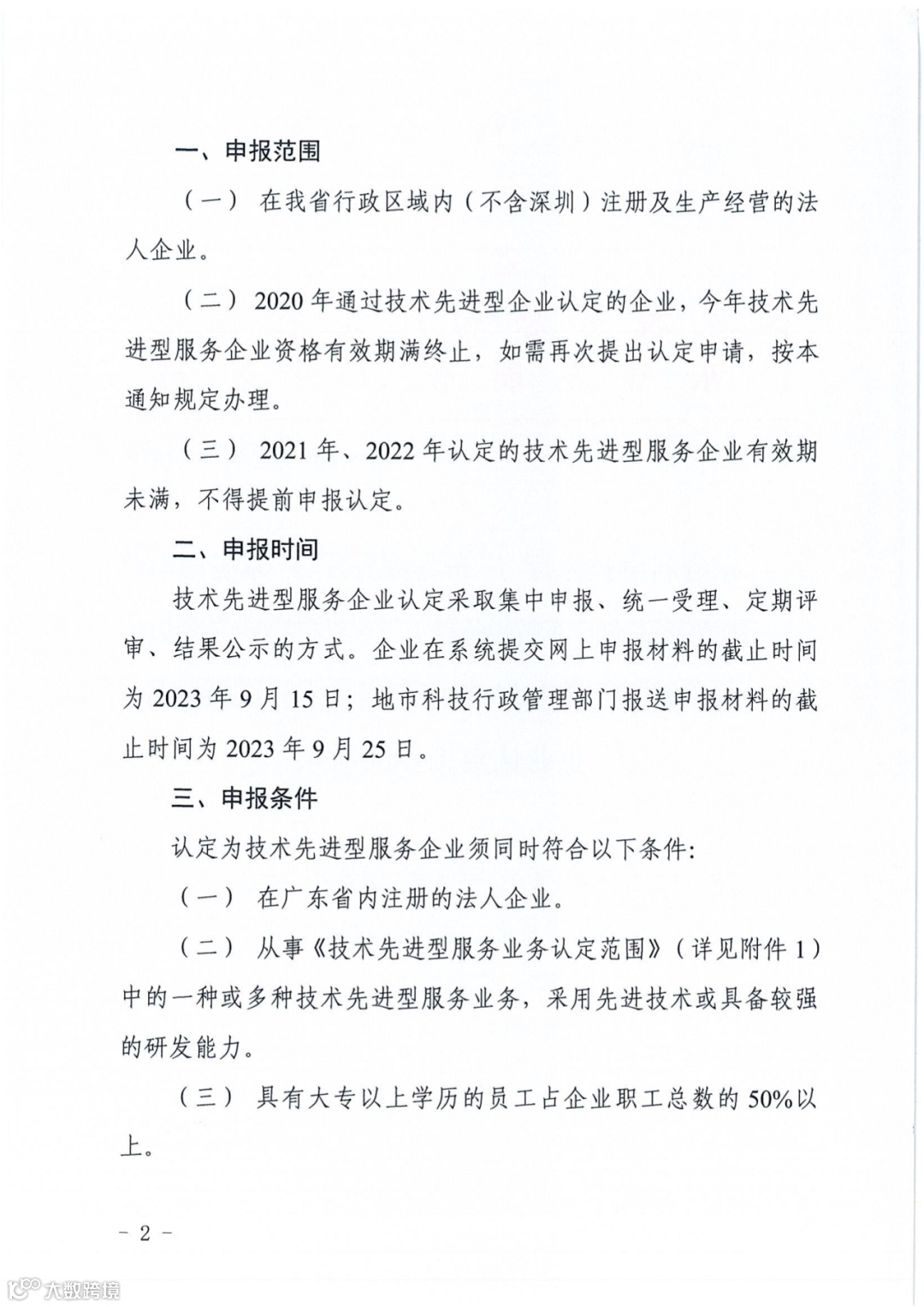 技术先进型服务企业认定采取集中申报、统一受理、定期评审、结果公示的方式。企业在系统提交网上申报材料的截止时间为2023年9月15日;地市科技行政管理部门报送申报材料的截止时间为2023年9月25日。