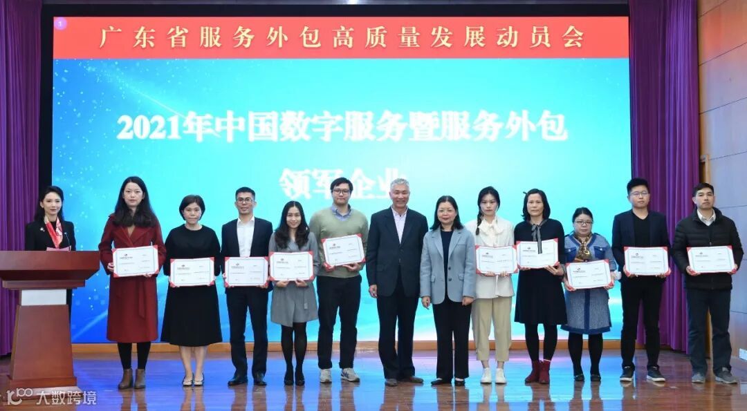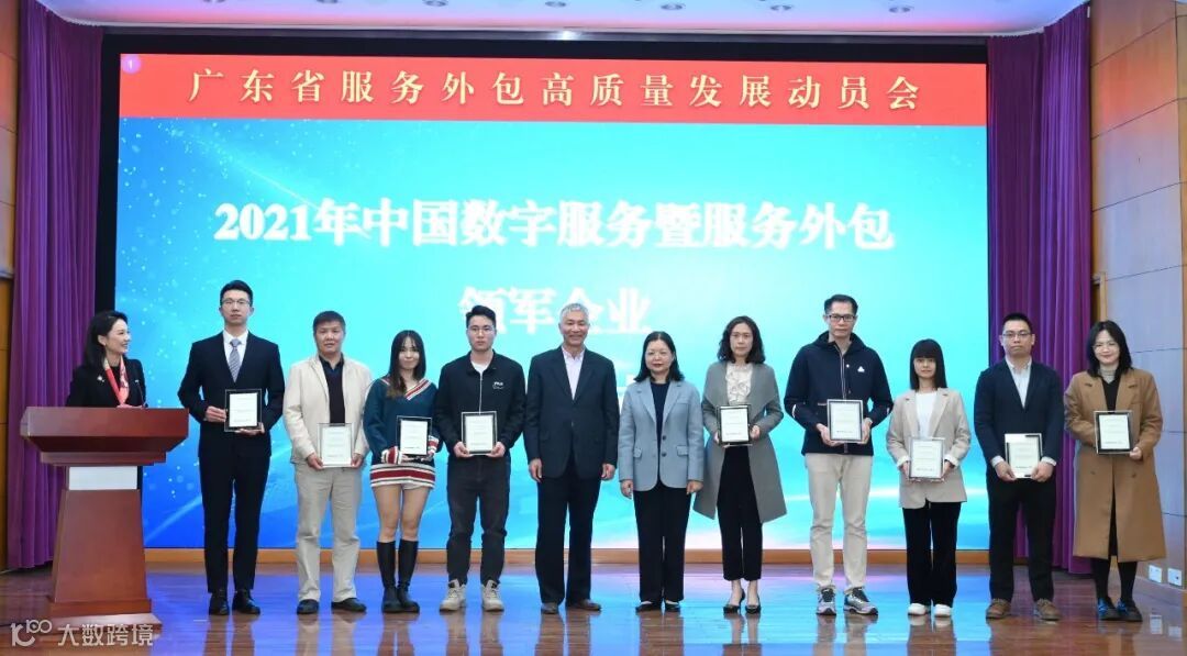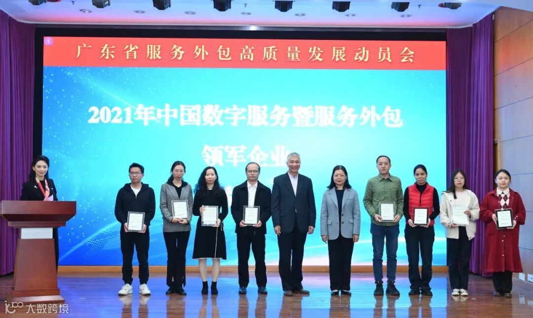 广东省商务厅赵尚群二级巡视员,广东省数字贸易与服务产业促进会孟霖会长为“2021中国数字服务暨服务外包领军企业”广东地区企业的授牌。