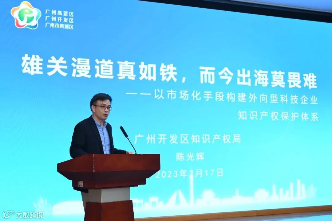 广州开发区知识产权局的陈光辉副局长,分享《以市场化手段构建外向型科技企业知识产权保护体系》。陈光辉指出,中国企业的海外知识产权纠纷问题已成为企业出海的一大难题。在广州开发区知识产权局积极推动下,人保财险广州市分公司签订了全国首单知识产权海外侵权责任保险保单,帮助企业开展海外业务时候降低风险,为企业保驾护航。他希望更多的服务外包和服务贸易企业参与其中,共同健全企业海外知识产权纠纷应对工作机制。