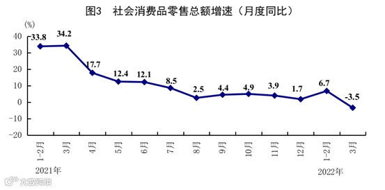 一季度,社会消费品零售总额108659亿元,同比增长3.3%。按经营单位所在地分,城镇消费品零售额94292亿元,增长3.2%;乡村消费品零售额14367亿元,增长3.5%。按消费类型分,商品零售98006亿元,增长3.6%;餐饮收入10653亿元,增长0.5%。基本生活类商品销售良好,限额以上单位粮油食品类、日用品类商品零售额分别增长9.3%、6.6%。升级类商品销售较快增长,限额以上单位文化办公用品类、金银珠宝类商品零售额分别增长10.6%、7.6%。全国网上零售额30120亿元,增长6.6%。其中,实物商品网上零售额25257亿元,增长8.8%,占社会消费品零售总额的比重为23.2%。3月份,社会消费品零售总额34233亿元,同比下降3.5%,环比下降1.93%。