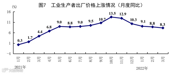 一季度,全国工业生产者出厂价格同比上涨8.7%。其中,3月份同比上涨8.3%,涨幅比上月回落0.5个百分点;环比上涨1.1%。一季度,工业生产者购进价格上涨11.3%。其中,3月份同比上涨10.7%,涨幅比上月回落0.5个百分点;环比上涨1.3%。