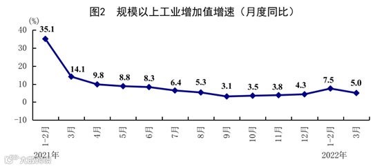 一季度,全国规模以上工业增加值同比增长6.5%。分三大门类看,采矿业增加值同比增长10.7%,制造业增长6.2%,电力、热力、燃气及水生产和供应业增长6.1%。高技术制造业、装备制造业增加值分别增长14.2%、8.1%,增速分别比规模以上工业快7.7、1.6个百分点。分经济类型看,国有控股企业增加值同比增长5.0%;股份制企业增长7.8%,外商及港澳台商投资企业增长2.1%;私营企业增长7.6%。分产品看,新能源汽车、太阳能电池、工业机器人产量分别增长140.8%、24.3%、10.2%。3月份,规模以上工业增加值同比增长5.0%,环比增长0.39%。3月份,制造业采购经理指数为49.5%,企业生产经营活动预期指数为55.7%。1-2月份,全国规模以上工业企业实现利润总额11576亿元,同比增长5.0%。