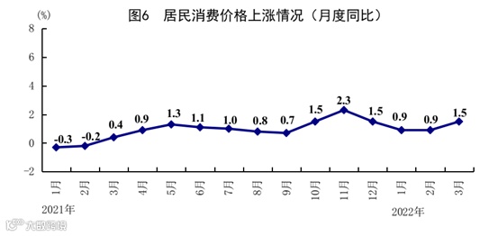 一季度,全国居民消费价格(CPI)同比上涨1.1%。其中,城市上涨1.2%,农村上涨0.7%。分类别看,食品烟酒价格同比下降1.3%,衣着价格上涨0.5%,居住价格上涨1.4%,生活用品及服务价格上涨0.6%,交通通信价格上涨5.5%,教育文化娱乐价格上涨2.6%,医疗保健价格上涨0.6%,其他用品及服务价格上涨0.7%。在食品烟酒价格中,粮食价格上涨1.7%,鲜果价格上涨6.9%,鲜菜价格上涨3.7%,猪肉价格下降41.8%。扣除食品和能源价格后的核心CPI同比上涨1.2%。3月份,全国居民消费价格同比上涨1.5%,涨幅比上月扩大0.6个百分点;环比持平。