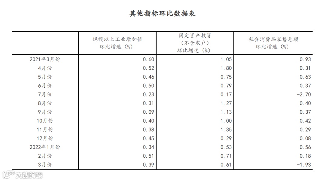 (2)根据季节调整模型自动修正结果,对近一年来各期国内生产总值、规模以上工业增加值、固定资产投资(不含农户)、社会消费品零售总额环比增速进行修订。修订结果及2022年一季度GDP环比数据、2022年3月份其他指标环比数据如下: