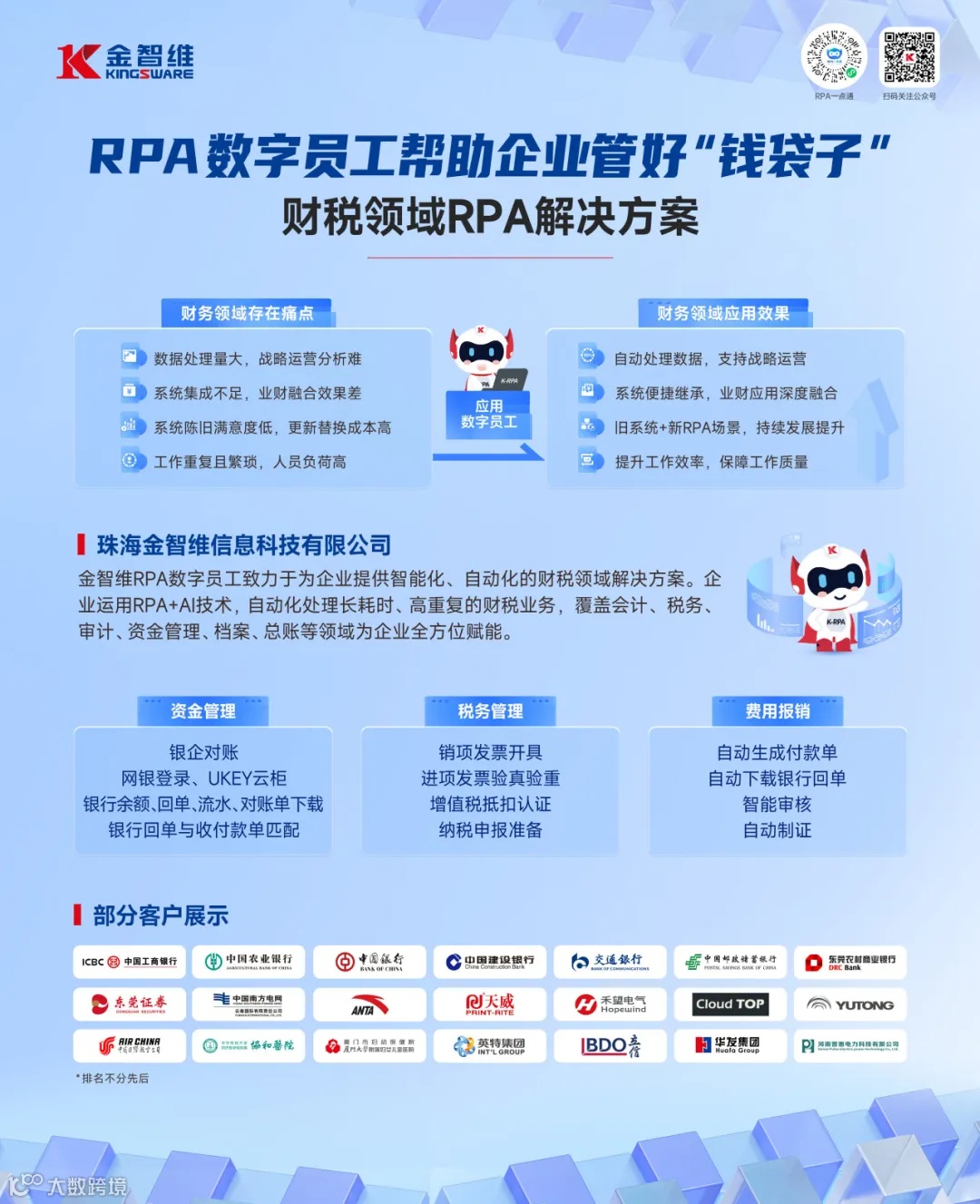 作为一家领先的数字化转型综合解决方案提供商,金智维已获评国家级专精特新“小巨人”企业,是数字员工领域的“领导者”,服务客户超1200家,为全行业提供超100万名数字员工,在IDC报告中被认定为中国RPA+AI解决方案市场份额第一。