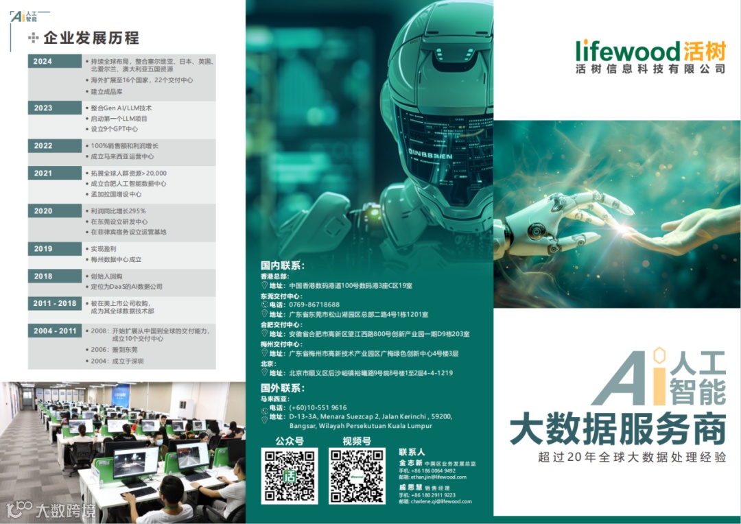 活树信息科技(Lifewood)成立于2004年,是一家面向全球,具备多语言能力及出海服务能力,为AI提供全方位训练方案的数据服务企业。