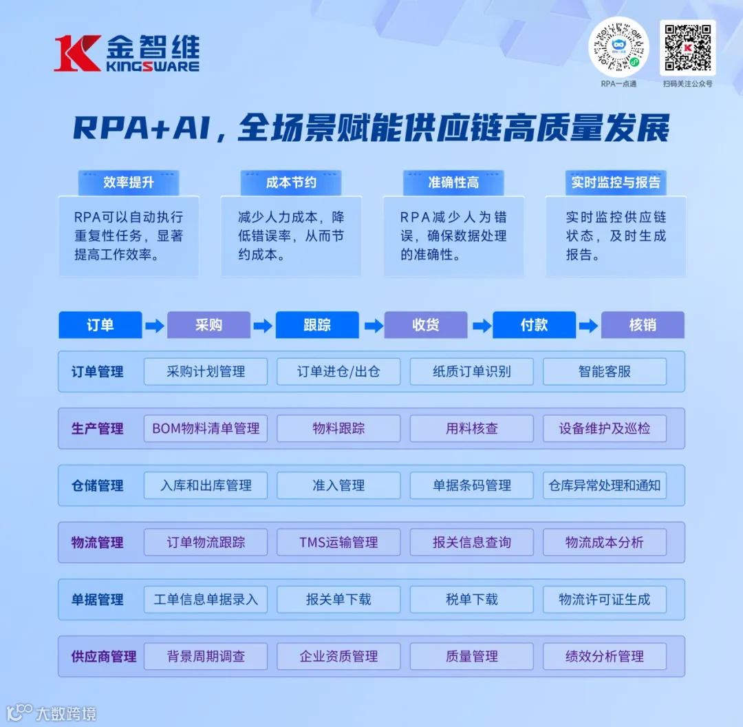 在技术和产品方面,金智维以RPA融合AI、低代码、大模型等创新技术,已形成包括RPA、AI、运维、低代码等系列在内的数字化能力底座,打造基于AI Agent的一站式数字员工整体解决方案,产品与服务体系丰富全面。金智维数字员工能够辅助人完成规则明确的重复性劳动,支持快速灵活部署,及时响应业务需求;能够帮助企业构建数字化连接能力,连接企业内外部的数据、系统、业务等,大幅提升业务流程效率;能够降低可能存在的人因错误,实现企业业务流程的自动化和智能化,从而达到降本增效的目标。金智维致力于用科技创新手段推动企业的数字化转型,探索和实现端到端的超自动化。目前,金智维技术与产品已全面适配国产主流基础软硬件,能够提供完整的信创解决方案。