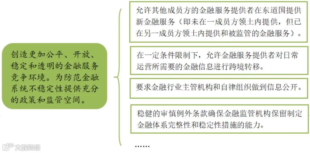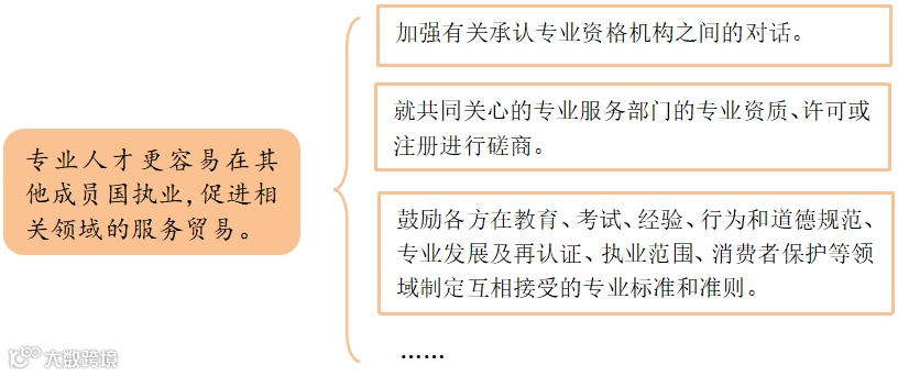 服务贸易章节包括25个条款和金融服务、电信服务、专业服务3个附件,以及各成员在服务贸易领域的开放承诺。通过纳入国民待遇、最惠国待遇、市场准入、本地存在、国内法规条款等,消减限制性、歧视性措施,为扩大成员国相互间的服务贸易创造了条件。