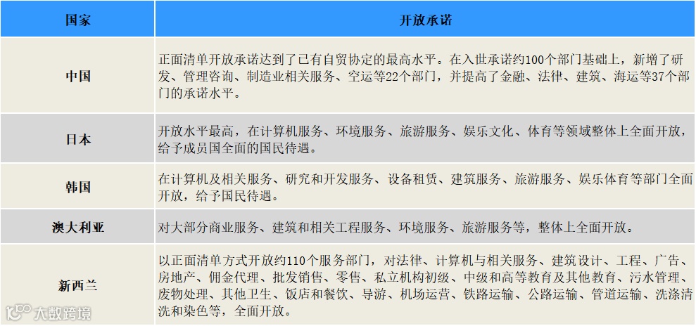 *中国、新西兰和泰国以“FL”(进一步自由化)的列表方式承诺“棘轮”义务,确定了未来进一步自由化不得回撤的部门,以锁定未来开放成果。