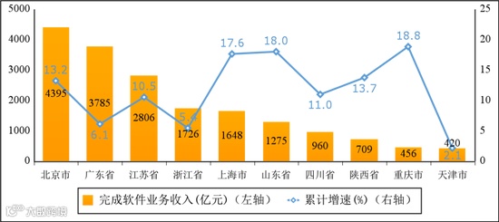 主要软件大省业务收入占比小幅下降。一季度,软件业务收入居前5名的省份中,北京市、广东省、江苏省、浙江省、上海市软件收入分别为4395亿元、3785亿元、2806亿元、1726亿元和1648亿元,分别增长13.2%、6.1%、10.5%、5.4%和17.6%,五省(市)合计软件业务收入14360亿元,占全国比重为71.6%,占比较去年同期回落0.8个百分点。
