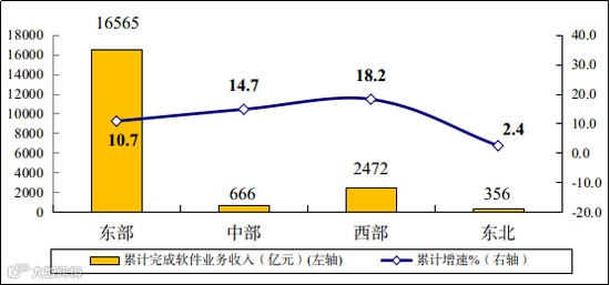 东部地区软件业收入稳步增长,中西部地区增势突出。一季度,东部地区完成软件业务收入16565亿元,同比增长10.7%,增速较1-2月份回落0.1个百分点;中部地区完成软件业务收入666亿元,同比增长14.7%,高出全行业整体增速3.1个百分点;西部地区完成软件业务收入2472亿元,同比增长18.2%,高出全行业整体增速6.6个百分点;东北地区完成软件业务收入356亿元,同比增长2.4%,增速较1-2月份回落4.4个百分点。四个地区软件业务收入在全国总收入中的占比分别为82.6%、3.3%、12.3%和1.8%。