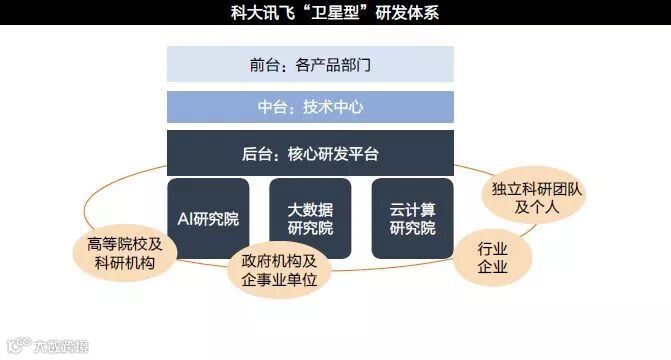 为此,科大讯飞一方面围绕其三大研究院构建企业自身的核心研发平台,另一方面从源头整合外部行业研发资源,通过与高校及科研机构、政府机构及企事业单位、行业企业、独立科研团队以共建联合实验室等形式展开合作,构建出了一套特殊的“卫星型”研发体系。