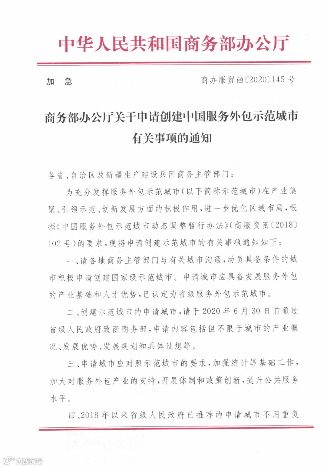 导读:创建示范城市的申请城市,请于6月30日前通过省级人民政府致函商务部