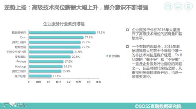一个值得关注的现象是,过去以低调著称的企业服务领域开始注重品牌的建设和宣传。2016年薪酬增幅最大的前十个岗位中唯一的非技术岗位是媒介经理,To B品牌的“做不好”和“不好做”,一直是企业服务行业面临的问题之一。在品牌时代来临之时,从重视相关岗位建设开始,也是一条重要途径。