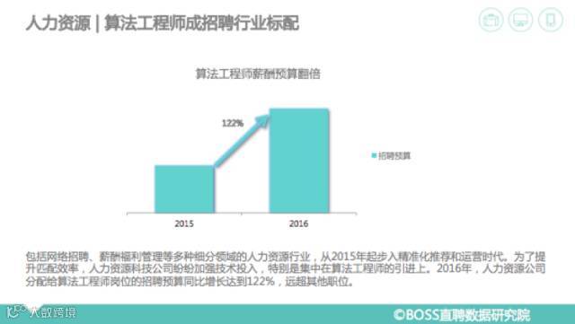 在包括网络招聘、薪酬福利管理等多种细分领域的人力资源行业,从2015年起步入精准化推荐和运营时代。为了提升匹配效率,人力资源科技公司纷纷加强技术投入,特别是集中在算法工程师的引进上。