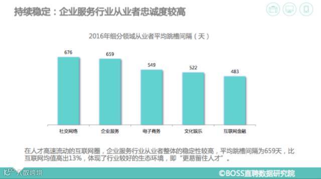 同时报告显示,在人才高速流动的互联网圈,企业服务行业从业者整体的稳定性较高,平均跳槽间隔为659天,比互联网均值高出13%,体现了行业较好的生态环境,即“更易留住人才”。