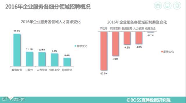 报告显示,企业服务的公司中,从事数据服务、IT软件、人力资源、信息安全领域服务的企业需求增长最快。受市场环境影响,IT软件、网络营销领域薪资降幅明显,信息安全领域薪资持平。