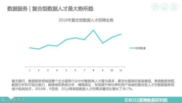 从人才的需求情况也可看出目前这几个企业服务的垂直领域目前的发展趋势。在数据服务领域,目前公司主要发力的重点是数据的挖掘和可视化。因此兼具数据挖掘、数据分析和可视化能力,能够做到系统分析,精确表达,有效提升转化率和用户体验的复合型人才在数据服务领域中极其抢手。