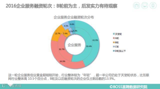 BOSS直聘的报告显示,这一轮企业服务创业黄金期刚刚开始,行业整体较为“年轻”,公司以B轮前的为主。超一半公司仍处于天使轮状态,比互联网行业整体高 10.5个百分点。这些公司仍以小规模为主,100人以下的公司占到总数的66%,较为灵活。