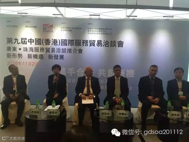 黄会长受邀为珠海市服务外包专家,参与了推介会高峰对话环节,与国内及香港专家、企业家共同就“新形势下 广东—珠海服务贸易的新机遇”进行了探讨。