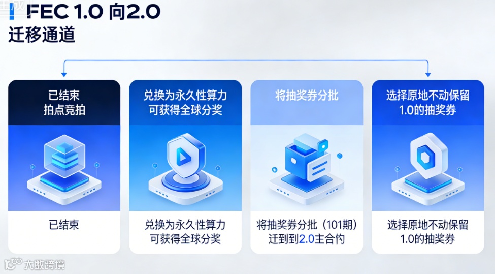 1.0向2.0的迁移通道:明确了1.0用户面临的四个选择通道:一是已结束的拍点竞拍;二是兑换为永久性算力,可获得全球分红;三是将抽奖券分批(101期)迁移到2.0主合约;四是选择原地不动,保留1.0的抽奖券等待释放。