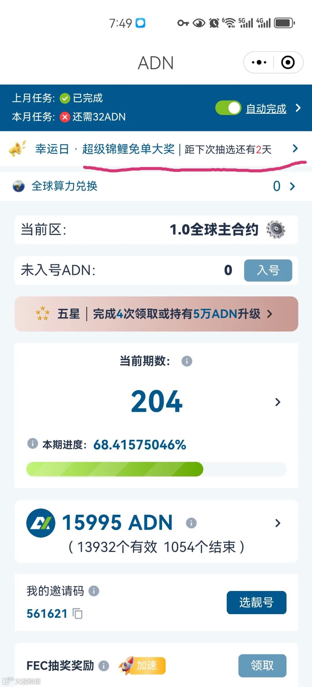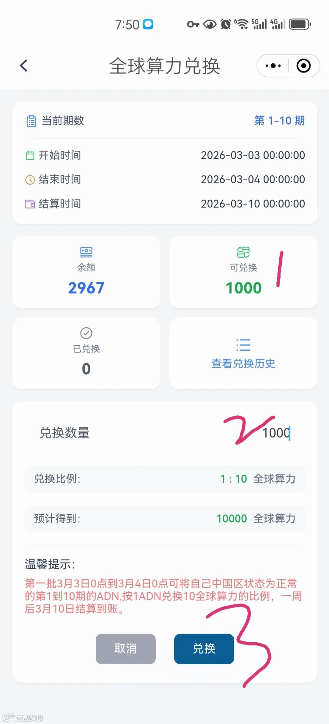 兑换限额:每账号最多兑换1000个ADN,即最多获1万个全球算力;